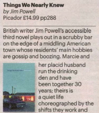 British writer Jim Powell’s accessible third novel plays out in a scrubby bar on the edge of a middling American town whose residents’ main hobbies are gossip and boozing… While the plot is expertly spun out, characters lapse too readily into cliché. It is an engrossing read but not a particularly nutritious one. [read more]