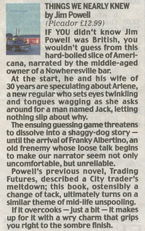 If you didn’t know Jim Powell was British, you wouldn’t guess from this hard-boiled slice of Americana, narrated by the middle-aged owner of a Nowheresville bar.At the start, he and his wife of 30 years are speculating about Arlene, a new regular who sets eyes twinkling and tongues wagging as she asks around for a man named Jack, letting nothing slip about why. … Powell’s previous novel, Trading Futures, described a City trader’s meltdown; this book, ostensibly a change of tack, ultimately turns on a similar theme of mid-life unspooling. If it overcooks – just a bit – it makes up for it with a wry charm that grips you right to the sombre finish. [read more]